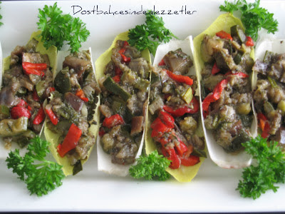 Birde hafif yağda kızarttığım patlıcan ve kabak larıda küçük marul yapraklarında servis yaptım...kırmızı biber ve maydanoz ile süsleyerek, nerdeyse hepsi yendi..