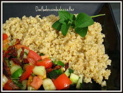 Ama hamur sonrasi akşam için diyede son zamanlarda pirinç ve makarna yerine alternatif ve sağlıklı olan QUINOA yı seçtim, aynen pilav yapar gibi 1 kap quinoa için 2 bardak su olarak pişiriliyor, çok az tuz ve zeytinyağını da sonradan ilave edip yanınada bolca bahçe :) malzemelerinden karışık salatayıda birde et sotesi ilave edince lezzetli akşam yemeğimiz hazır oldu..
