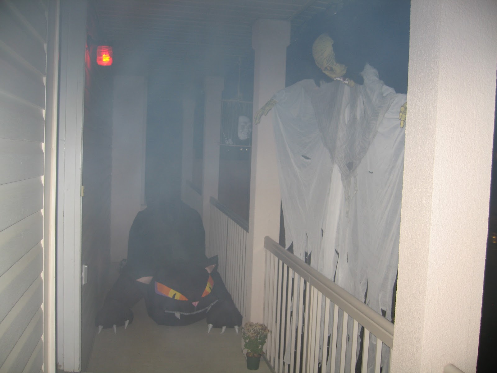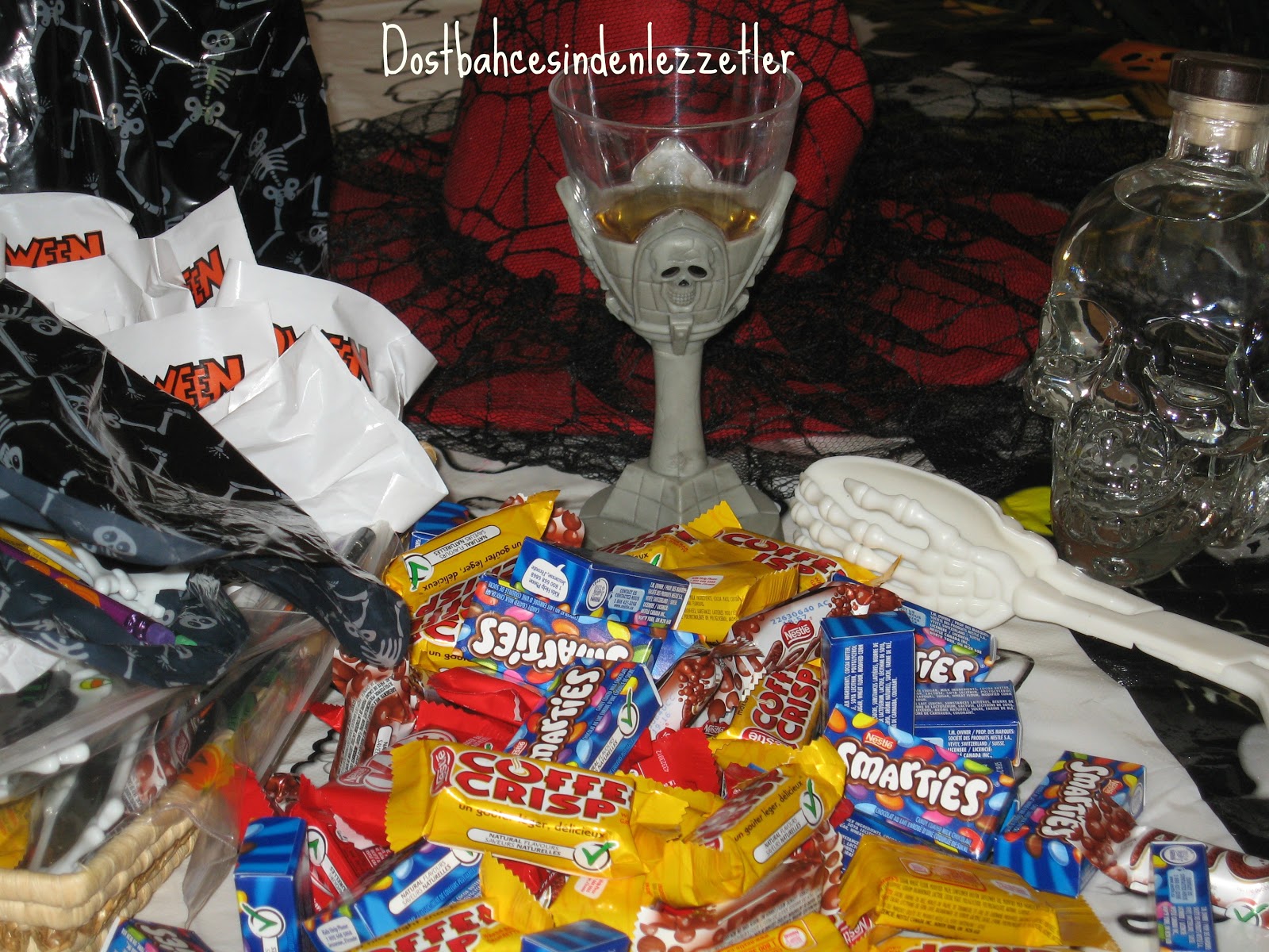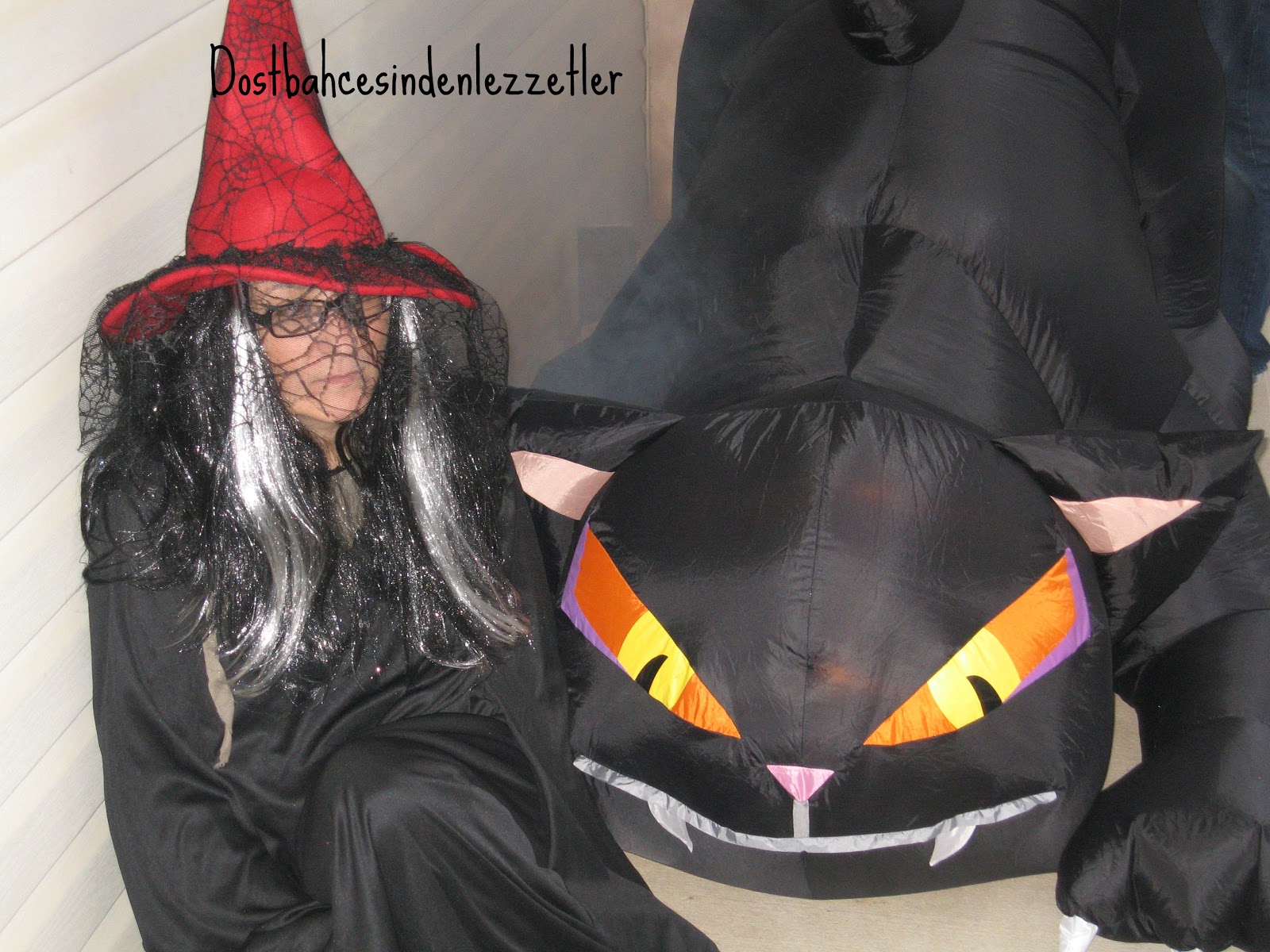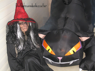 Cadılar bayramımız fazla soğuk olmayan bir gece ve çok az yağmur ile geçti gitti.Bu sene çok fazla dekor koymadık,canımız istemedi, Deren  birkaç hayalet astı, birde büyük kedimizi koyduk..müzik ve sis makinası ile hareket eden hayaletlerimiz ve ben kedinin yanında yerde, şekerleride yanıma alarak çocukları bekledik, makyaj yapmadım dolayısı ile fazla cadı ya benzemedim ama bazıları benim zaten cadı olduğumu söylerler:))hatta komşu bu akşam çocuklari ile gelince güzel kıyafet sanada yakışmış deyip sonra kahkahayi bastı:))Makyaj olmasada bazı çocuklar yinede nedense sanırım büyük ve kafası kımıldayan kediden ve etraftaki ışık ve sis ten korkup uzaktan uzaktan baktılar, yani benden değilde kediden korktular sanki:)yaklaşık 100 kadar çocuk geldi anne ve babaları ile, büyüklü küçüklü, şekerlerimiz bitincede içeri girip kapı ışığını kapadık ozaman gelip kimse kapı çalmaz ve şeker istemez...Saat 6 gibi dolaşmaya başlayip 7.30 civarı bitiyor gezmeleri, sonrasında büyük çocuklar geliyorki görülmeye değerler:)) Eğlence işte..hem çocuklara hem bize. Birkaç resim de sizlerle paylaşıyorum..