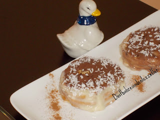 Aysunun yaptığı kurabiyeler de ağızda dağılan 1 tane yemekle kalınmayan, un kurabiyesinin aynısı gibi olup, sadece içine 1/2 bardak hindistancevizi ilavesi ile yapılmış.. benim ki ise kişisel bisküvi pastası olup: 2 bardak süt ile hazırladığım herkesin bildiği kolay puding tariflerinden birini hazırlayıp (sadece birkaç kaşık pudingi, pişirdikten sonra ayırıp içerisine çikolata ilave etmek sureti ile az miktar kahverengi puding elde ettim)yuvarlak bisküvileri süte hemen batırıp çıkarmak sureti ile tabaklara dizip üzerlerine beyaz pudingden kaşıkla koyup, tekrar bisküvi- puding, ve birkez daha tekrarlamak sureti ile (3 sıra yuvarlak bisküvi ile) kişisel minik pastalar yaptım, ve en üste yine beyaz ve onun üzerinede biraz kahverengisinden dökerek , bisküvi pastasının etraflarında az birşey pudingle kapatarak, kimini hindistan cevizi ile kiminide ceviz ile süsledim...