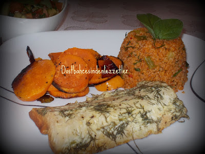 Güzel ve güneşli br haftaya başladık-umarım..Hafta sonundaki soğuk hava bir gece evin ısıtıcısını bile açtırdı..Güneş olsada rüzgar herşeyi bitiriyor, soğutuyor havayı: hırkalara, ceketlere sarılmadan dışarı çıkamıyoruz ama yinede güneşin olması bile artık ızgara zamanı, içerde yemek pişirmek yok, herkes bahçeye dedirtiyor ve özellikle akşam üzerleri herkesin bahçesinden ayrı-güzel ızgara kokusu dağılıyor..hal böyle olunca sebzeler bile ızgaraya taşınıyor..yaşasın yaz geliyor:) Türkiye oldukça sıcakmış, serin seviyorsanız buralara gelin derim..bir gün yaz bir gün kış..arada şikayet ediyoruz artik yeter bizde ısınalım diye ama bu haftadan itibaren daha çok sıcak hava olacakmış,,rüzgar olmasın razıyım:) Herkes ızgara başında olunca dün akşam bende hem tatlı patates ve biber karışımını hemde balıkları ızgarada yaptım..(yani BBQ de yaptım..hani biliyorsunuzdur emiminde, bilmeyen olupta BBQ yaptım diye duyarsanız aklınızda olsun oldukça büyük, tüplü ızgaralar burada herkesin bahçesinde..hatta kimi tüp kullanmayıp içine kömür doldurup, kömürdede pişiriyor hemde lezzeti açısından mutlaka daha güzel oluyor, sanırım Türkiyedede vardır artık bahçesi olanlara hatta balkonlara bile ideal ızgara çeşidi) Evet tatlı patates le başlayım..iki adet patetesi iyice yıkayıp incecik kesin..1 adet herhangi çeşit biberi minik doğrayın, folyo üzerine pişirme kağıdı koyup önce biberleri, üzerine tatlı patatesleri koyup az zeytinyağı gezdirip, tuz ve taze çekilmiş karabiber ilavesi ile folyoyu kapatın ve bir kenarda bekletin...