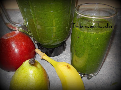 Sağlıklı tarafından, sebze ve meyve karışımından yapılmış: smootie gibi, oldukça koyu, nerdeyse kaşıkla yiyebileceğiniz tarzda ama bir okadarda vitamin, mineral, fiber içeren ve bundan sonra 15 gün ve+ her sabah 1 büyük bardak içmeye karar verdiğim-şimdilik-ve 15 gün sonunda her hangi bir şekilde farklılık oluşup mutasyona uğrarmıyım bilmiyorum, mutlaka sizlerle paylaşırım..tabiki bu işin şakası ama son derece faydalı bir içecek olduğundan şüphem yok ve bu sadece verilen tariflerden biri olup benimde ilk denediğim..dolayısı ile belki sizde yapıp içmek istersiniz diye tarifi paylaşıyorum..