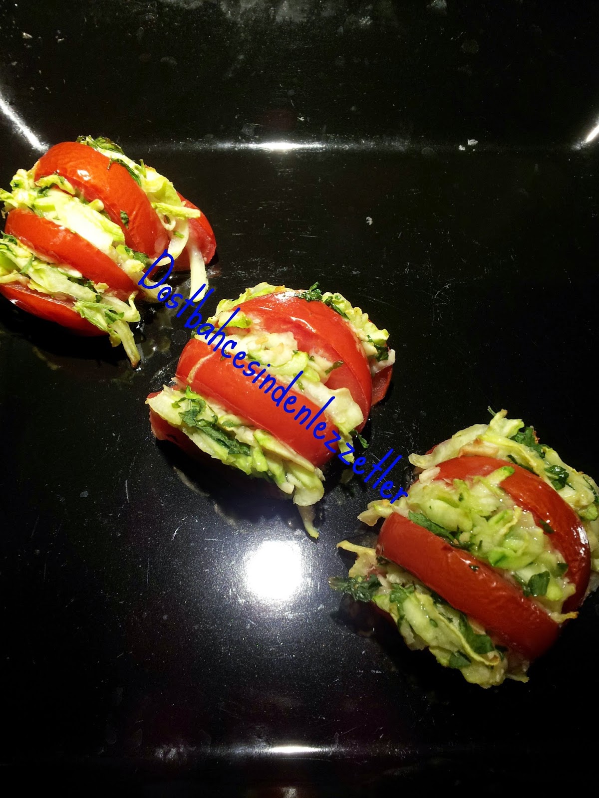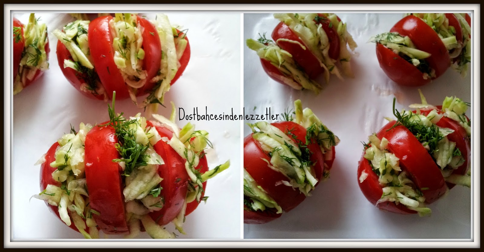 Sebzeleri yıkayalım. Domatesleri üçe keselim ama alt kısmı ayrılmasın. Kabağı rendeleyip, suyunu sıkalım. Maydanoz yada dereotunu ince kıyıp, az tuz ilave edelim.Kabak ve maydanoz/dereotunu karıştırıp, domateslerin arasına dolduralım. 1 diş sarımsağı ezelim ve z.yağınla karıştıralım. Kabak doldurulmuş domatesleri fırın tepsisine dizelim, üzerine sarımsaklı z.yağını gezdirip 350“F/180’C de önceden ısıtılmış fırında 15dk.pişirelim.İşte bu kadarrr. Deneyin pişman olmazsınız. Afiyet Olsun!